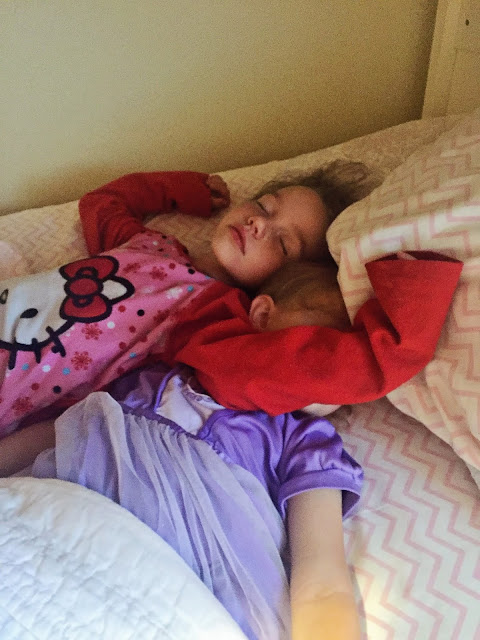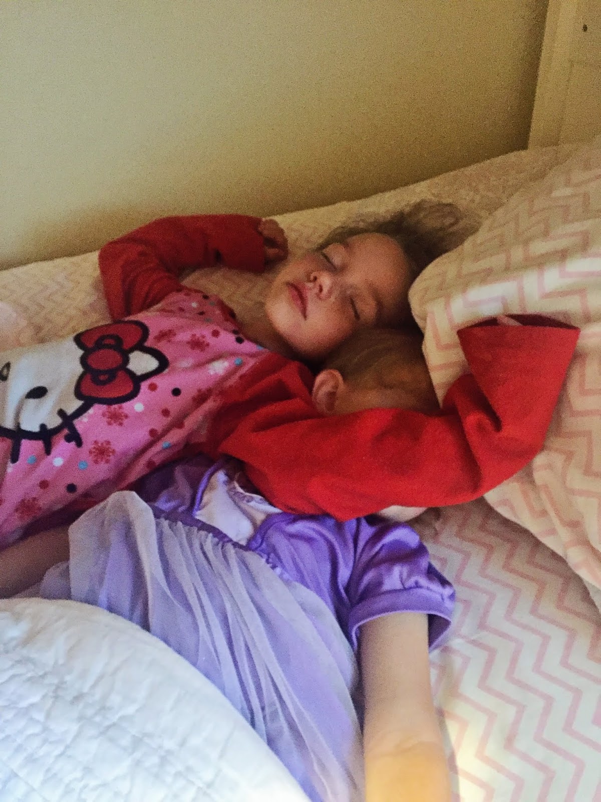 Sometimes I find that the girls have gotten into bed with each other in the night.. although I have no idea why they would want to. How do you sleep like that? Poor Isla!